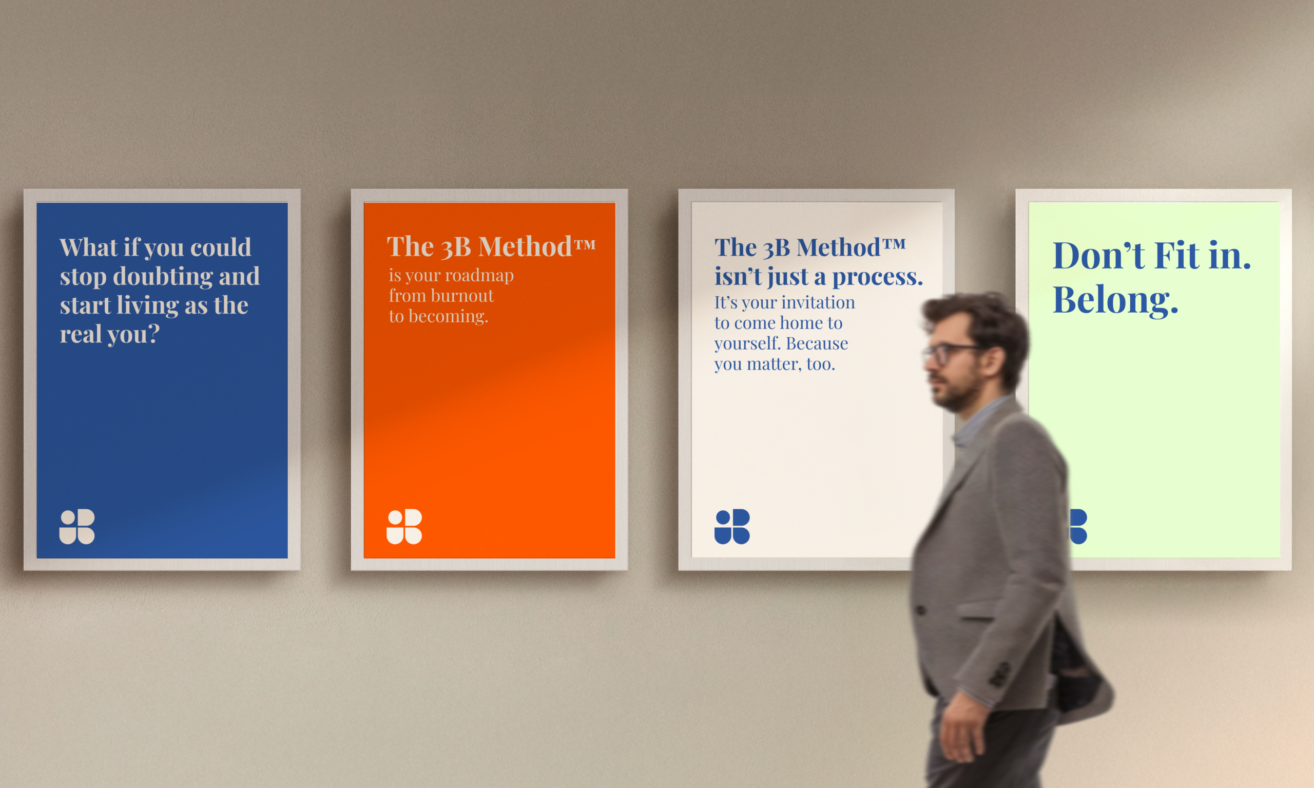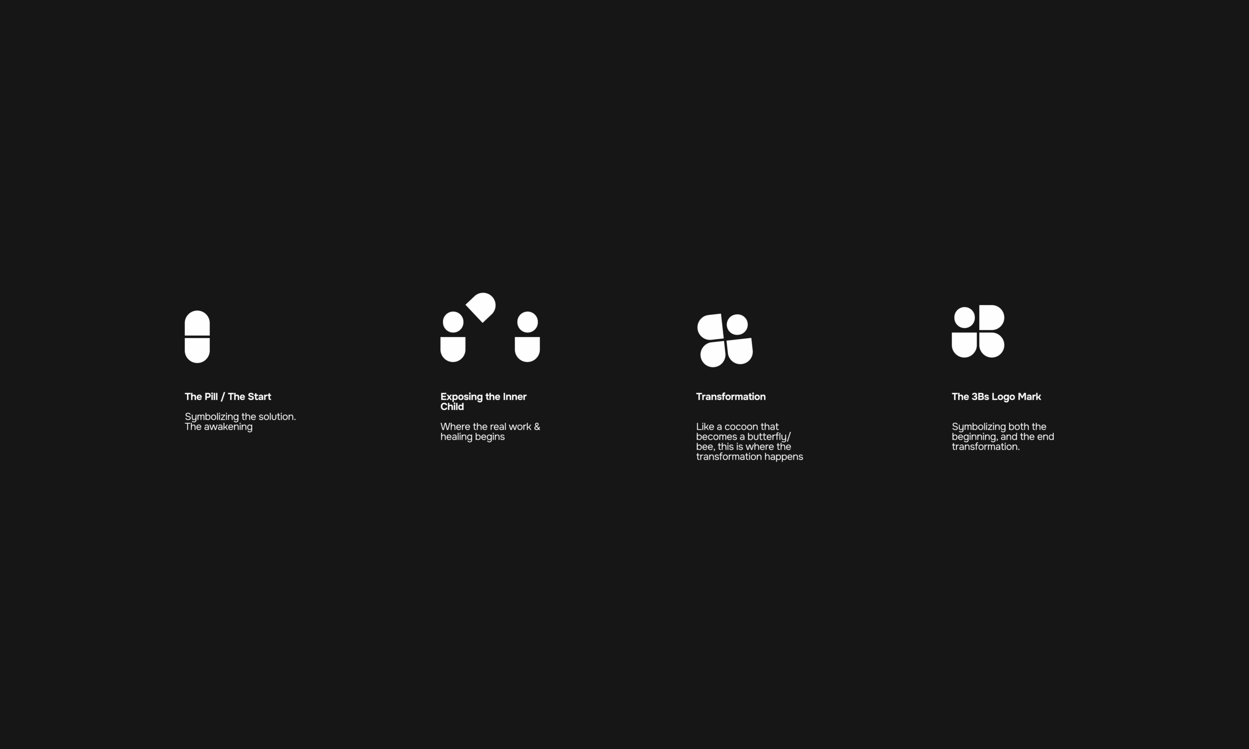 We started with deep brand discovery, uncovering the pillars of her work — the 3B Method™: Beneath → Breakthrough → Becoming. This journey became the structural foundation of the brand. The logo itself is a visual metaphor — beginning as a pill (a choice to awaken), evolving into a cocoon, and eventually symbolizing transformation, integration, and belonging.