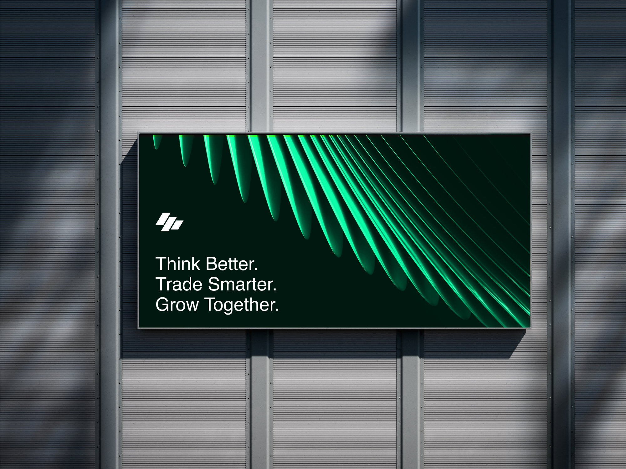 The identity system is driven by a sharp, neon green palette (#00F19D) contrasted with deep black and pure white for high clarity and instant recognition. The logo mark merges upward candlestick movement with momentum, forming a strong visual metaphor for compounding gains and clarity in decision-making.